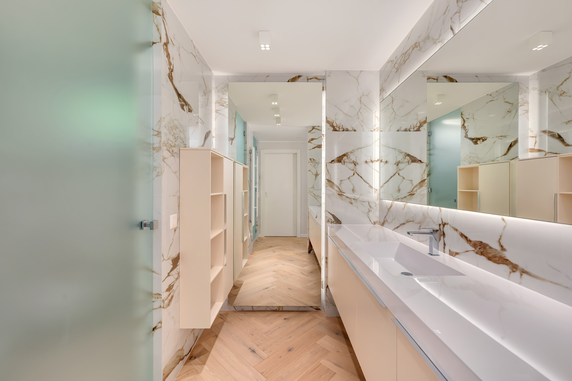 L’appartamento è stato curato nei minimi dettagli: vetri in alluminio con doppi vetri, ognuno dotato di zanzariere, riscaldamento e raffrescamento a pavimento con ricircolo dell’aria, corridoio rivestito con gusto, e pavimenti in parquet su tutto l’appartamento, ad eccezione dei bagni, rifiniti in gres di grande formato. È stata realizzata una cabina armadio su misura, curata nei minimi dettagli, di circa 30 mq, un’ulteriore di circa 18 mq e una di 12 mq.